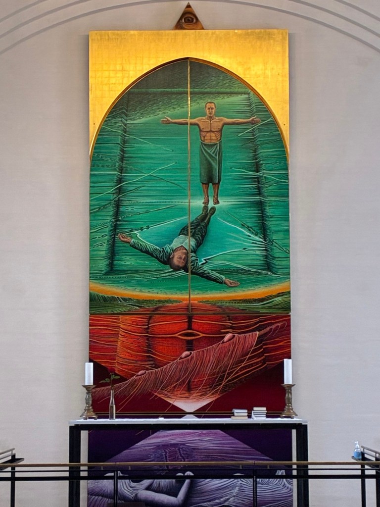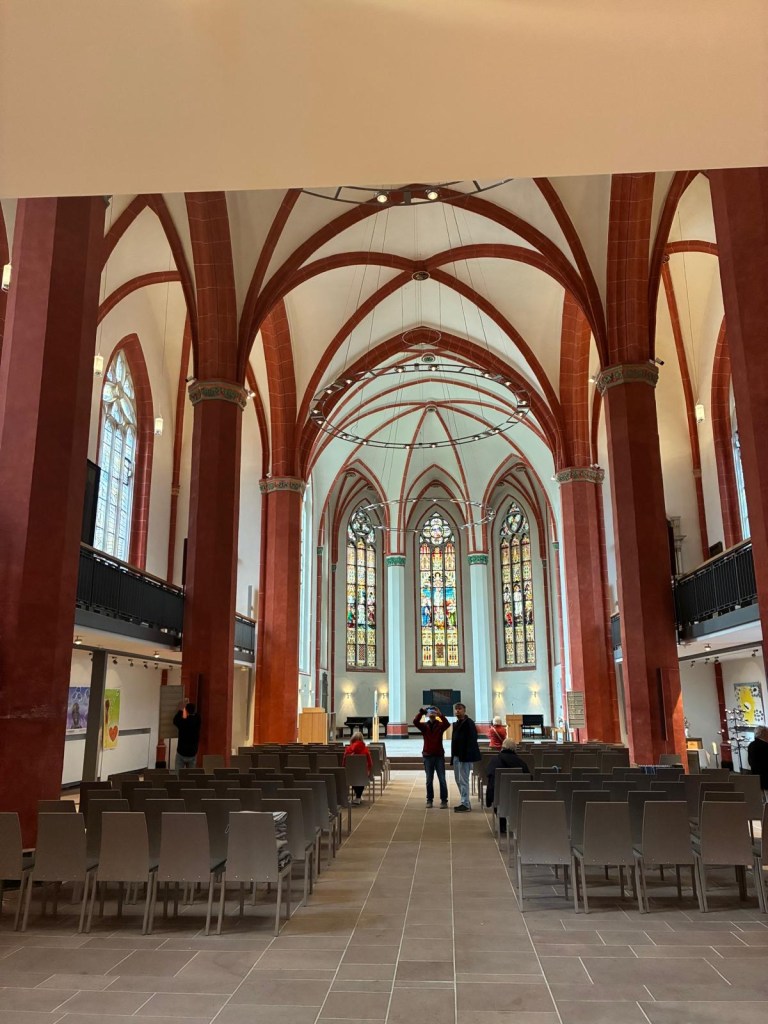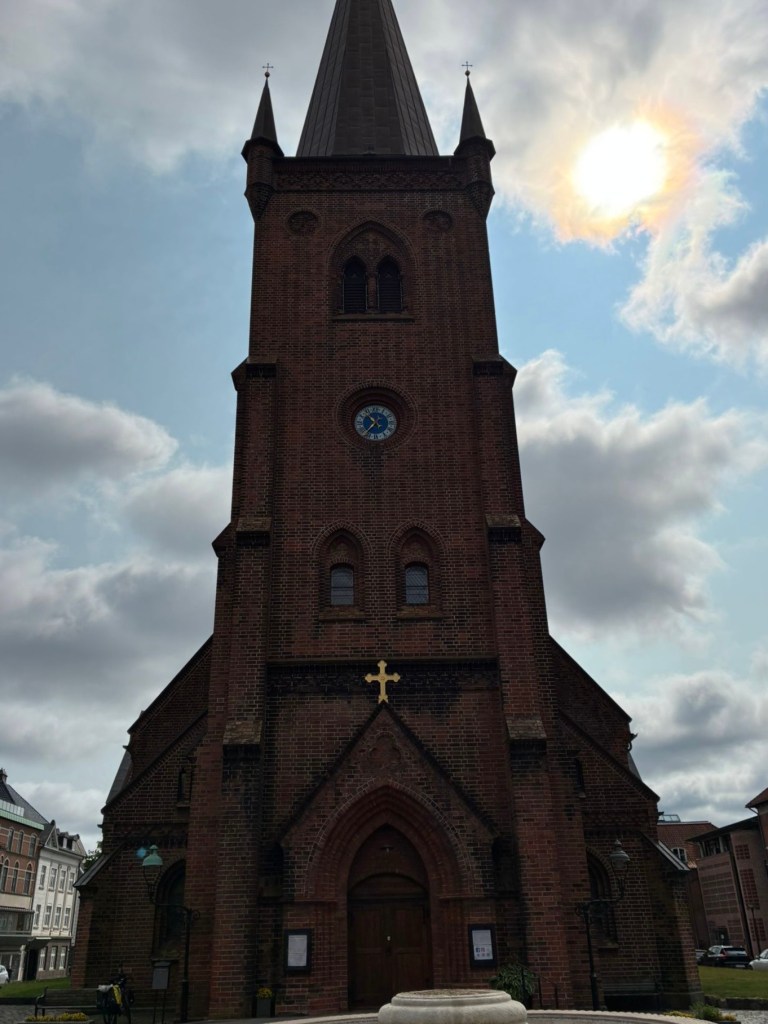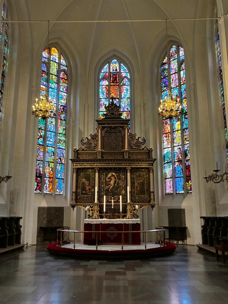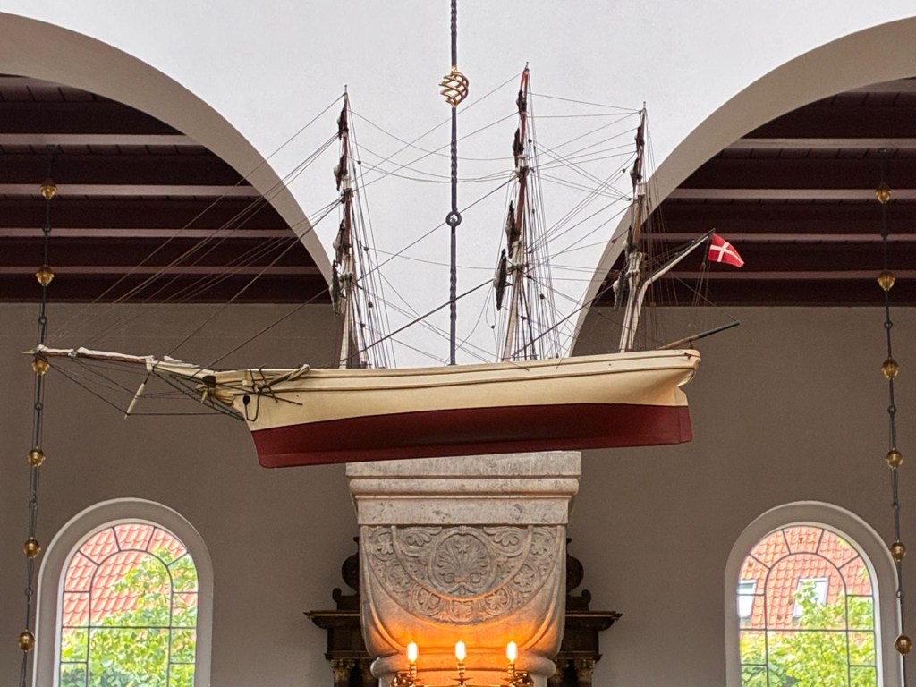 Danach mache ich mich auf die Suche nach einem Set kleiner Inbus-Schlüssel. Entdecke dabei aber zuerst die Vor Frue Kirke, was auf Französisch übersetzt etwa „Notre Dame“ ergäbe. Auffallend das Modell eines Segelschiffs, das mitten im Kirchenschiff zwischen den Leuchtern hängt. Faszinierend der Altar, mit einem rot eingewandeten Jesus, dessen Kleid, aber auch Körperhaltung eher einer Frau entsprechen. Gewollte Ambivalenz? – Ich ziehe weiter.